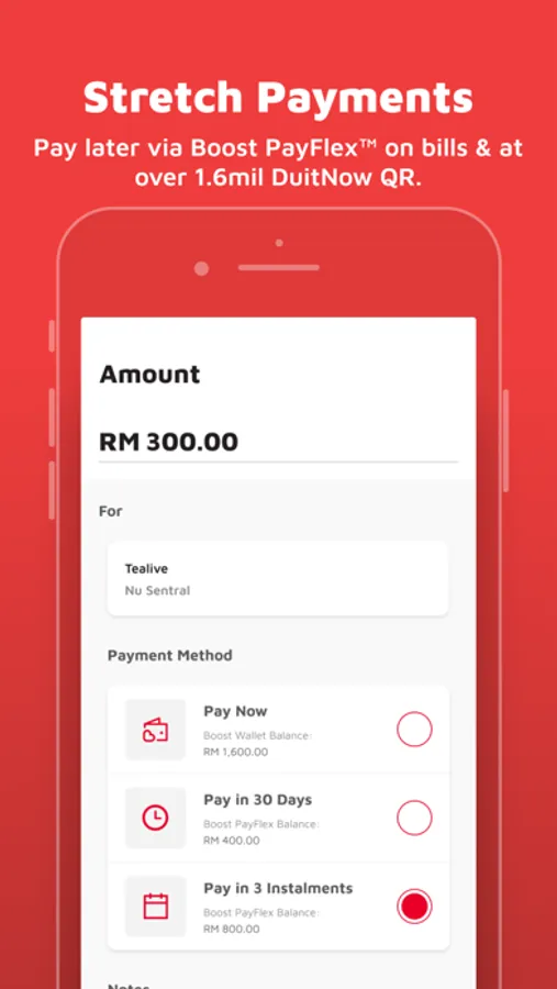 Shopping? Travel expenses? Bill payments? Enjoy whatever you want now and pay later with Boost! Activate Boost PayFlex in 3 simple steps and enjoy flexible payment terms on bills and at over 1.6 million DuitNow QR merchants. Pay in 30 days or in instalments, based on your preference.