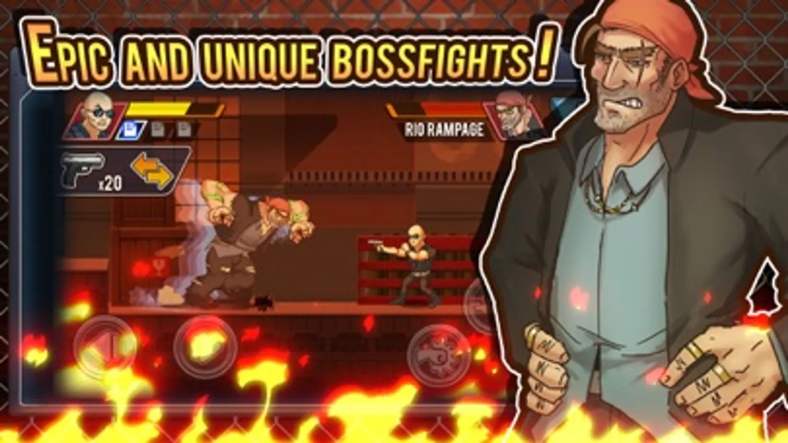 FIGHT, SHOOT, and PUNCH through enemies with your martial arts skills, weapons, and dashing bald head. Take on enemies such as Drone, Punks, and the evil Corporation. Fight unique Bosses and beat them all with your FIST OF RAGE!