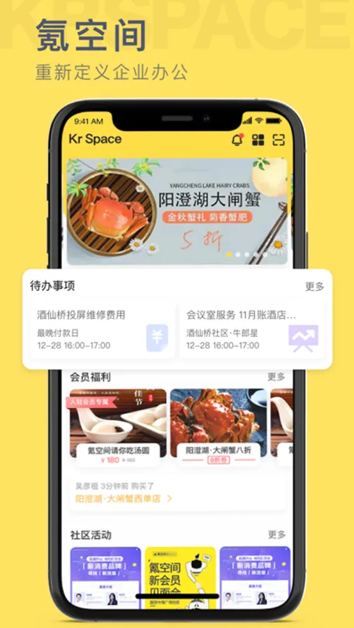 氪空间的会员App是一个连接社区内所有创新创业者的互动平台。不管身处何地,都可以在这个平台上发布商业信息,与全国其他会员共同探讨创新想法和寻求互动合作。同时会员App还可以用来预定所有社区的会议室和办公空间,随时随地满足会员的办公需求。