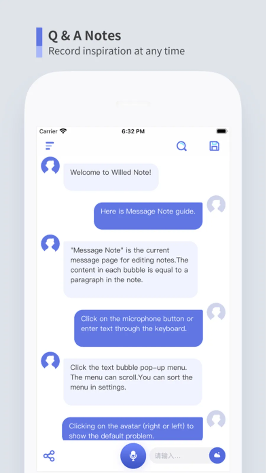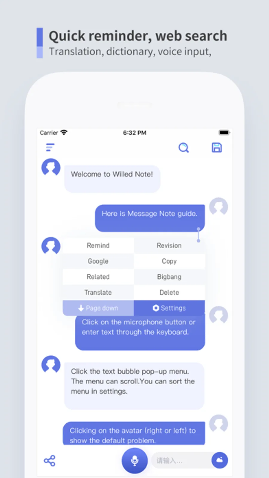What is the experience of taking notes in the form of message? Willed Note implements the Message Note feather ,which is not only convenient for fast recording inspiration, but also can input text by voice, translate text quickly,search text by Google.By the way,Message Note can be edited and viewed in traditional ways.