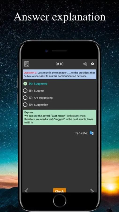 + Each of a Practice contains 20 questions, picked randomly in order to get the student used to different types of questions.