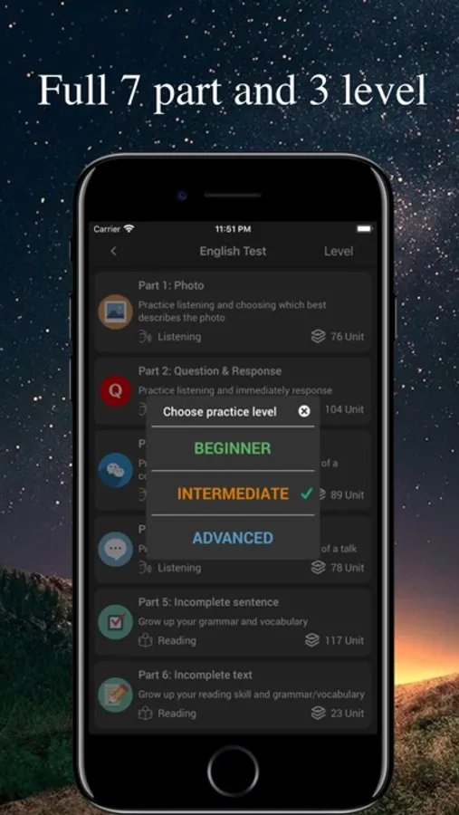 This app is provide you a huge number of practices with full of listening and reading skills like Picture Description, Questions & Responses, Short Conversations and Short Talks, Incomplete sentence, Incomplete text, Reading comprehension.
