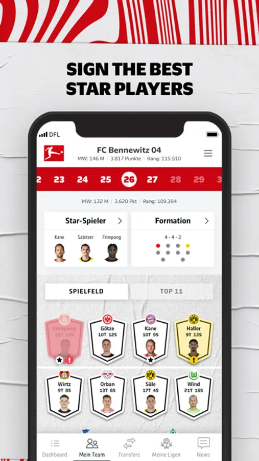 Choose your 15 top players in the Bundesliga regardless of which club they play for and create your fantasy team with a budget of 150 million:
