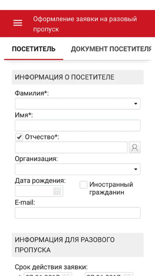 • создать заявку на разовый пропуск на посетителя с указанием даты или периода действия пропуска, компании посетителя, а также марки и номера его автомобиля;