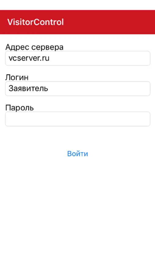 ВАЖНО: для работы мобильного приложения требуется интернет-подключение к работающему серверу VisitorControl версии 6. Для работы с приложением вам необходимо ввести ваш логин и пароль, а также указать адрес сервера. Эту информацию вы можете получить у специалиста по информационной безопасности или системного администратора вашей компании.