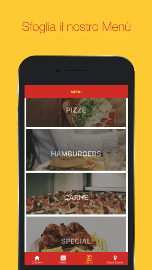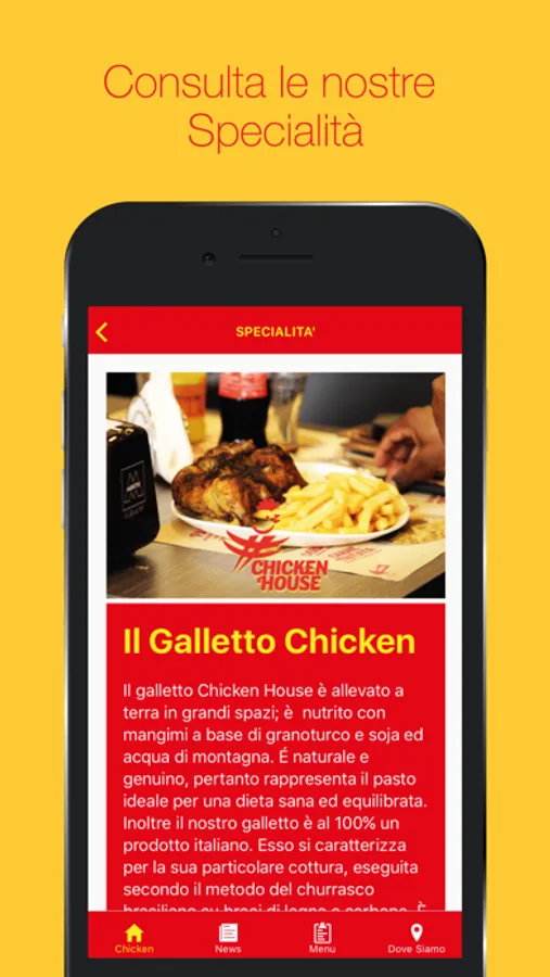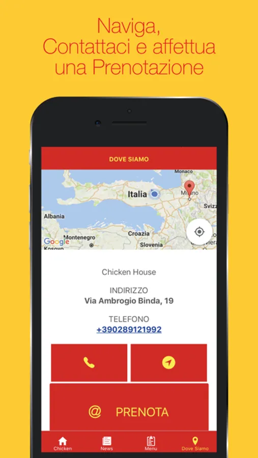 Sarà possibile sfogliare il Menù nel dettaglio con le specifiche sulle specialità della casa, la possibilità di Prenotare direttamente dall'App, aggiungendo al Carrello i piatti desiderati, oppure con il tasto Chiama interagire in maniera diretta con il locale. Infine, tramite il pulsante Naviga ricevere indicazioni da Google Maps per navigare dalla propria posizione fino da ChickenHouse.