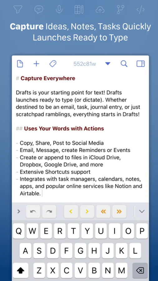 Drafts is where text starts. Quickly capture text and send it almost anywhere!