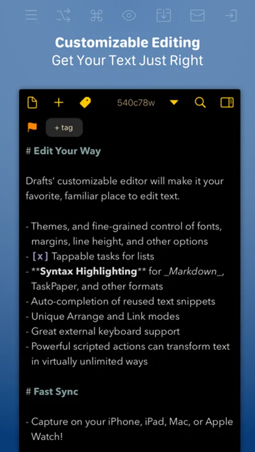 Customize Drafts to look and work the way you want with tons of interface adjustments — custom fonts and control over spacing, line height, and margins.