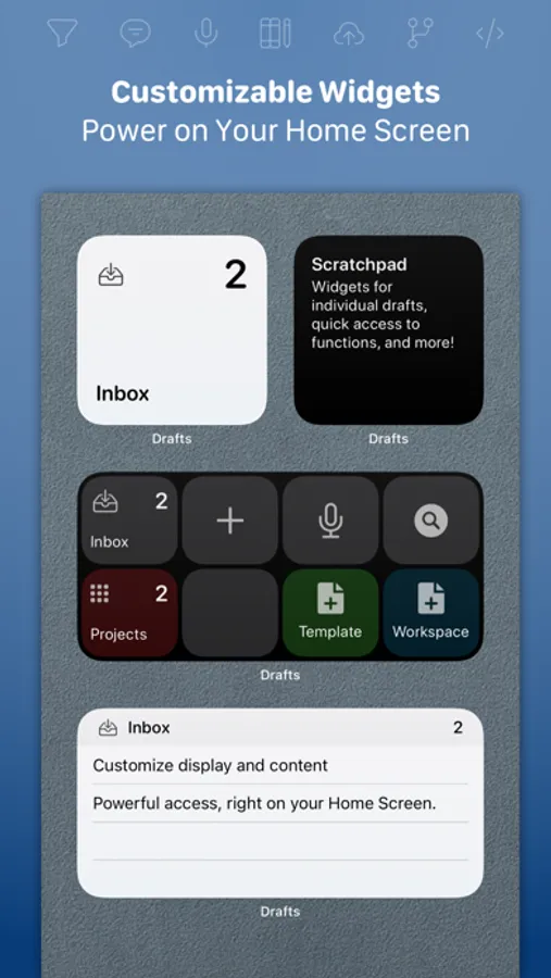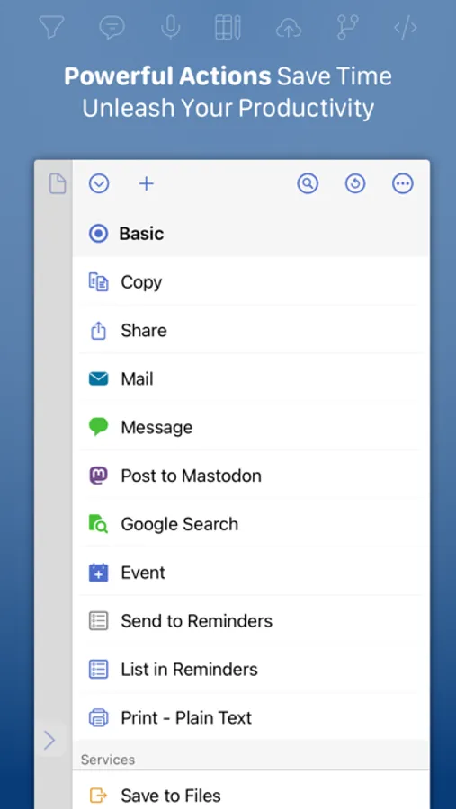 Drafts is a jumping-off point for text — use actions to copy it, share it, or deep-link into other apps and services. Compose a tweet, draft a message, create a file in Dropbox, send a task off to Reminders – Drafts works with tons of your favorite apps and services.