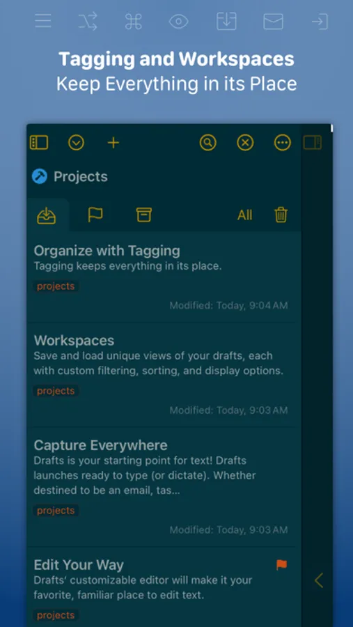 • Workspaces - Apply preferred tag, query, and sort settings for your drafts list with Workspaces