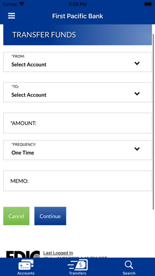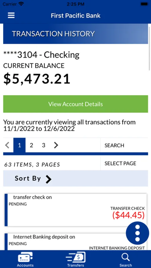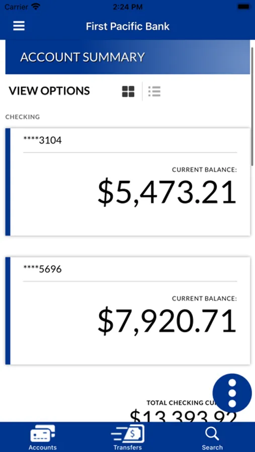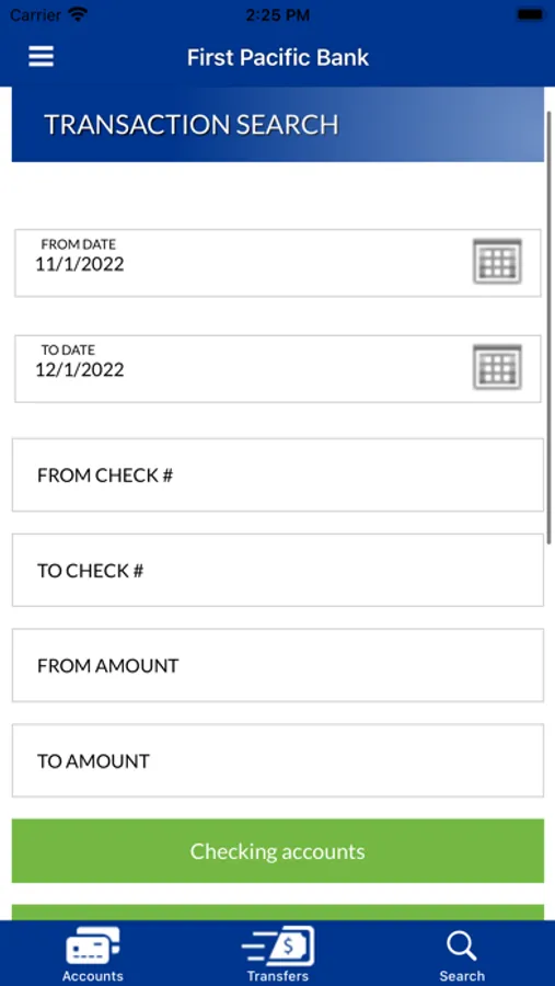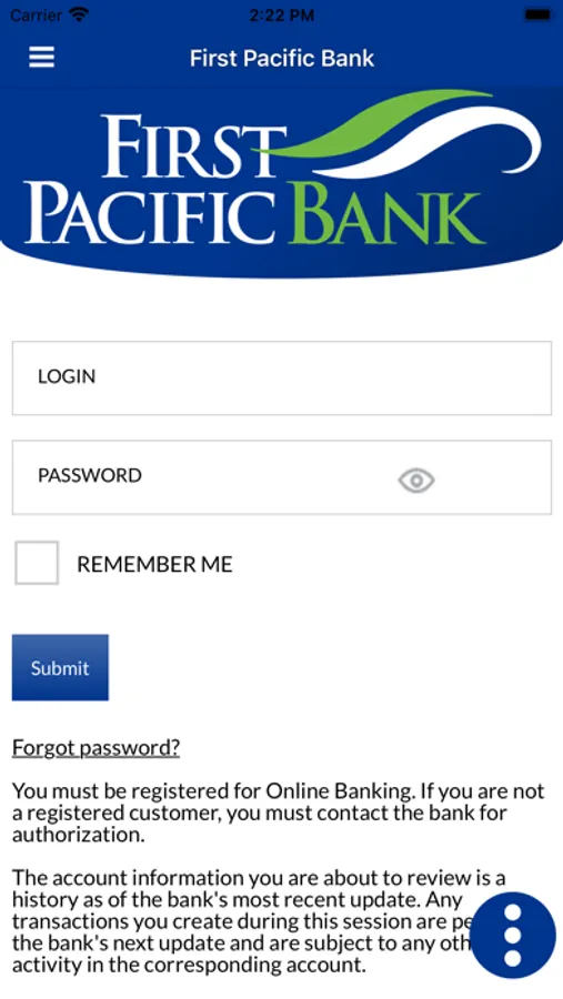 The First Pacific Bank App from First Pacific Bank allows you to easily and securely access your accounts on the go! With your Free First Pacific Bank App you can view balances and trasnactions history as well as perform funds transfers and loan payments between accounts within First Pacific Bank. You must be a registered Online Banking customer to utilize this App.