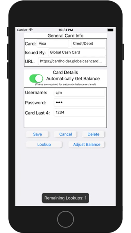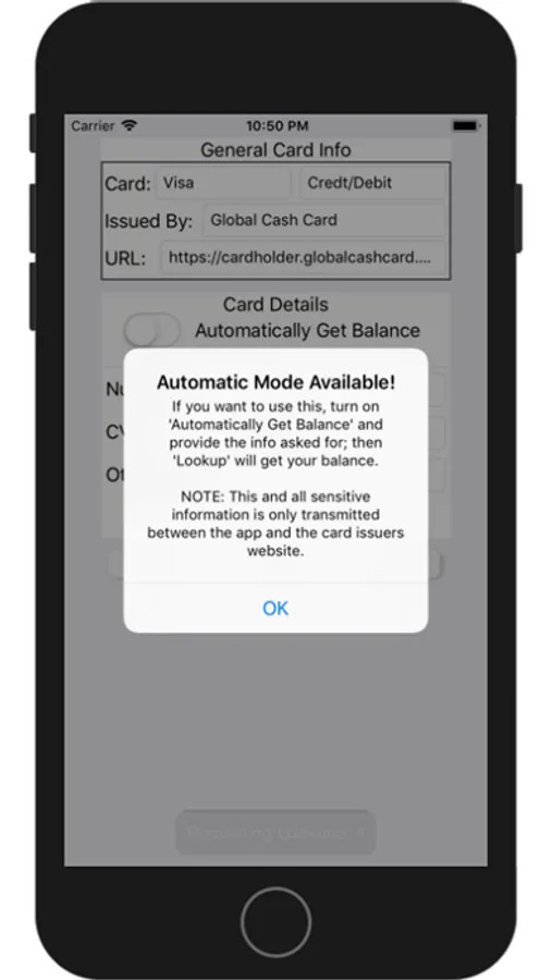 For other prepaid cards, the app works by using your device to go to the appropriate website where the balance can be looked up. Once there, the app has the ability to automatically fill in the information required . Once the balance is retrieved, you’d push the button to update the balance and your data is recorded.