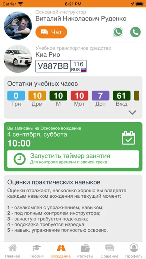 Возможности для инструктора: составление личного расписания занятий, список курсантов, маршруты занятий, запись и отмена занятий, тексты ПДД, билеты по ПДД, получение уведомлений, ввод результатов экзаменов.