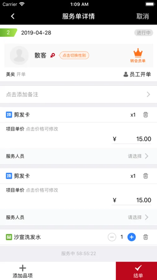 【结单】完成服务后,结束服务单,生成无纸化账单。