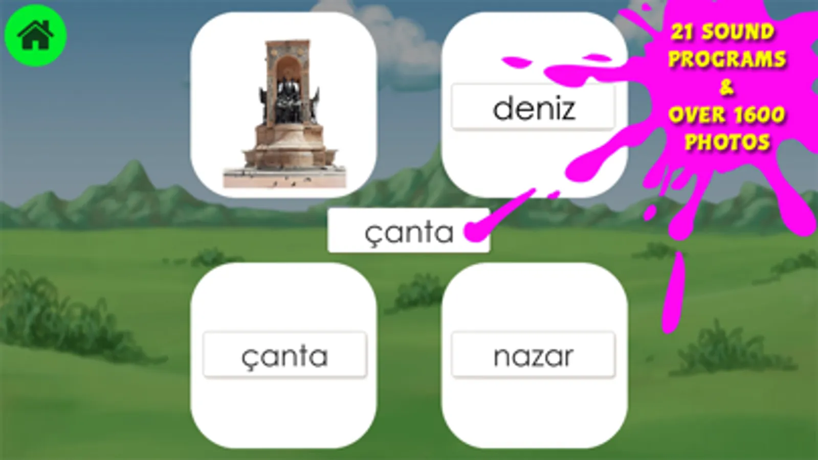 It is a complete articulation program offering at the word and phrase level 21 sounds in the Turkish. Seven engaging activities are presented via over 1600 real photographs isolated on a white background that are easy to identify. The whole program is based on standard Istanbul Turkish.
