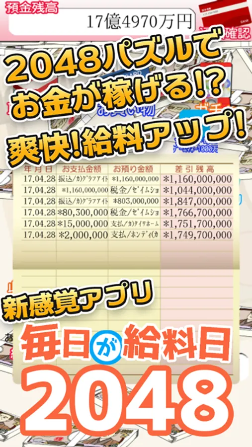 世界中で人気の超簡単でハマると話題の数字パズル「2048」と、お金の爽快感にハマる「毎日が給料日」のシステムが融合!