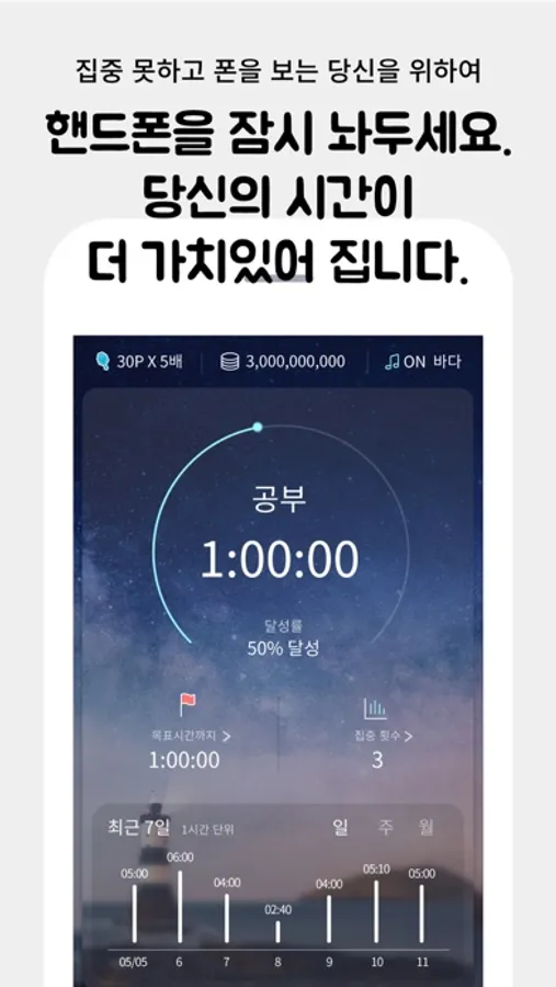 집중하려고만 하면 휴대폰을 만지는 당신을 위해 잠시 휴대폰을 내려놓고 집중할 수 있도록 도와드립니다. 더욱더 집중되는 시간으로 인생의 시간이 가치있어 집니다.