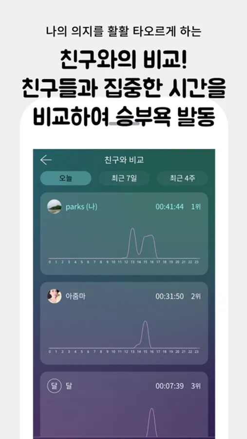 친구를 등록하면 친구들과 실시간, 주, 월별로 집중시간을 비교하고 친구들 사이에서 몇 등 했는지 알 수 있습니다.