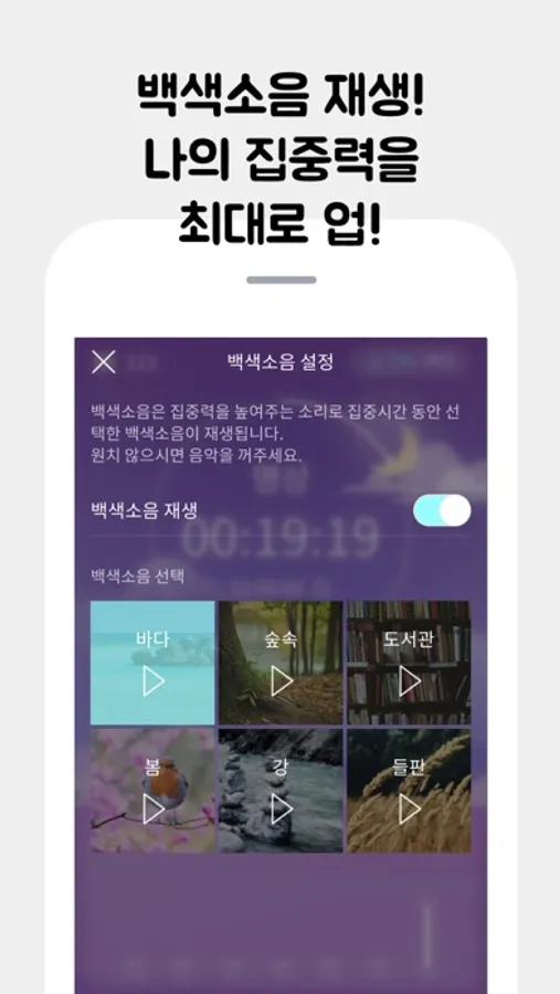 백색소음은 많은 연구를 통해 집중력을 향상시키는데 도움을 준다는 사실이 입증되어 있습니다. 다양한 백색 소음을 제공하고 있으며 사운드 설정을 통해 집중하는 시간 동안 백색소음을 재생할 수 있습니다.