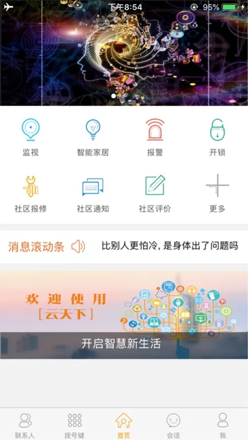 云天下APP将互联网+与传统楼宇对讲、智能家居等完美结合,产品将可视对讲作为社区入口,通过云后台将物业、业主、访客、门禁、等服务并入,让生活变得简简单单,语音、视频无处不在,社区生活更为方便。让人人都能感觉到:家就在眼前,社区就在身边,世界就在指尖。