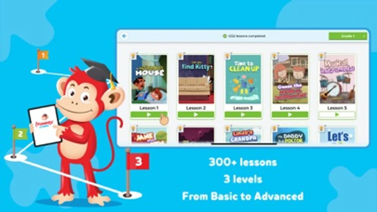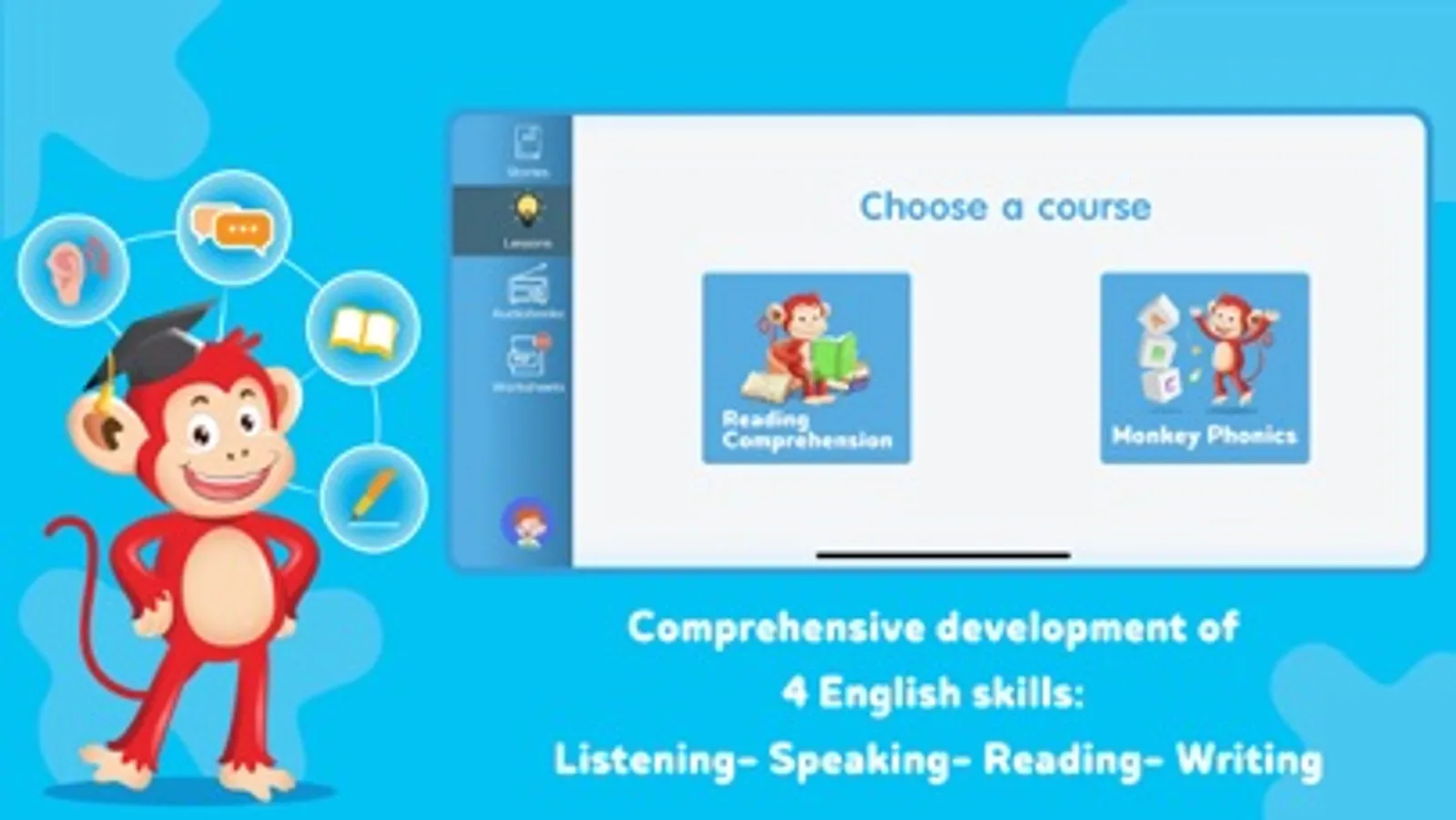 Monkey Stories is most suitable for children aged 2-10 which helps children develop the four skills of listening, speaking, reading and writing.