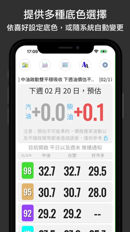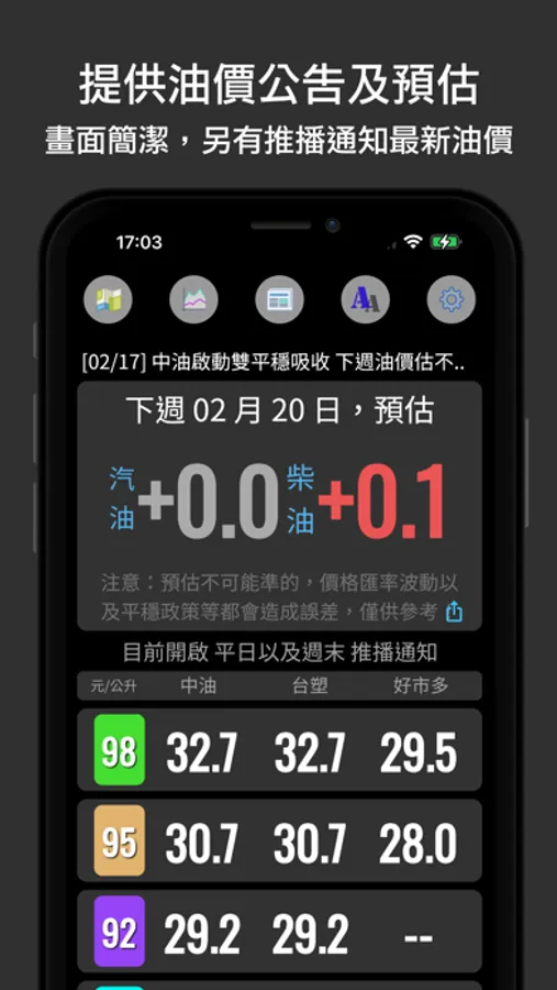 油價快訊 -- 提供台灣油價公告、油價預測、歷史油價圖、推播通知、附近加油站以及基本天氣資訊