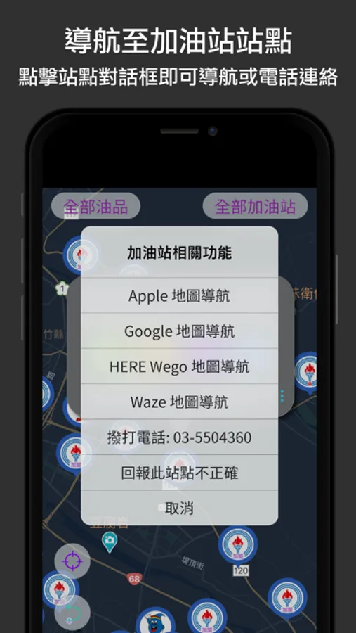 導航功能:地圖加油站點支援打開 Apple Map/Google Map/Waze/HERE Wego 做站點導航,另外可直接播打電話。