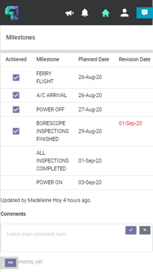 • Remote video collaboration: A physical presence to monitor your maintenance event is not always required. To ease with decisions or approvals you can join a remote event, see your asset and collaborate on further steps.