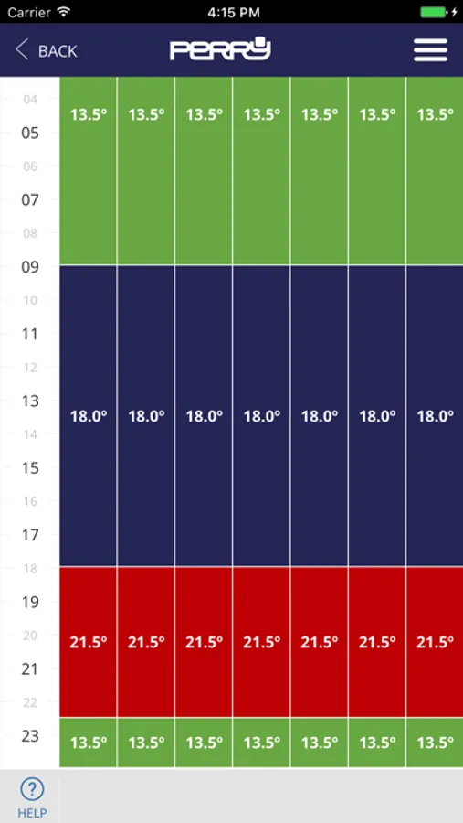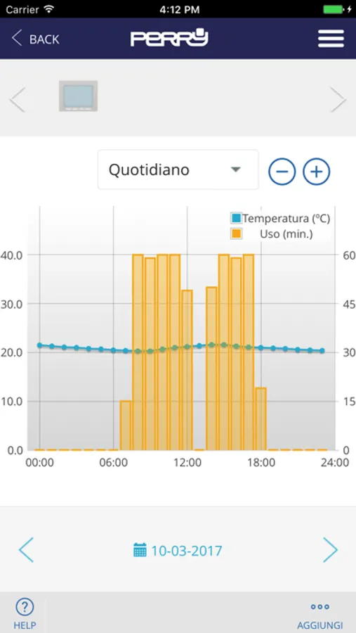 PERRY CRONOTHERMOSTAT allows the setting of Perry timers read consumption, hours of operation, see the daily, monthly and yearly temperatures average, of each unit, on comfy charts.