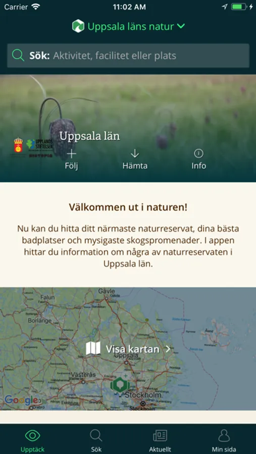 Naturguide till länets natur med innehåll från Länsstyrelsen i Uppsala län, Upplandsstiftelsen och Biotopia.