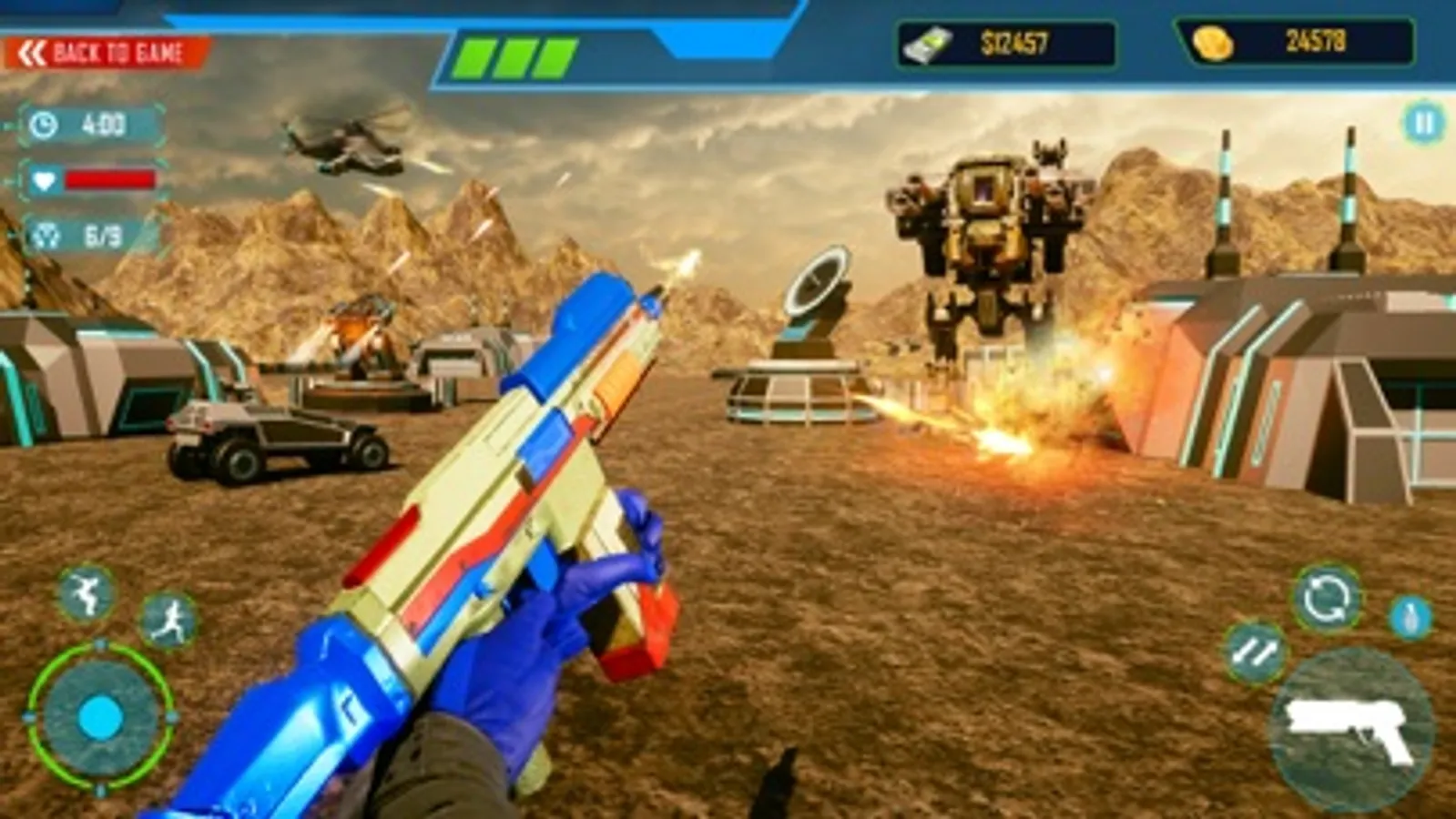 In this shooting robot game, there are different challenging levels in this street fight of steel robots. This sci fi robotic street fight is worth playing, this robotic war is going to be held between transformer steel robots and player robot shooter. These futuristic robots in this war robot game are alien robots like iron man, they came from other world and they want to capture most modern scientific lab. Let me tell you that this robotic fight in this shooting robot game is with other robot strike force. You may have played many other shooting games but this steel robot shooting in this robotic fight game is worth playing. In this robot war game the opponent are not humans but the alien robots from the other world. The robot force that will fight in robotic fight is consisting on real robots who are savior of this planet.