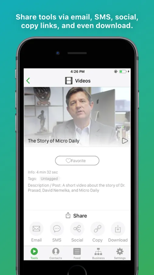 Media: It has never been easier to share information about your products and opportunity via SMS text, email, or social media. Simply choose tools specifically designed to promote your business and share them with a contact. You'll receive a notification when contacts view a tool so you know exactly when to follow up! No data connection? No problem! Simply download content in the app beforehand for offline playback.