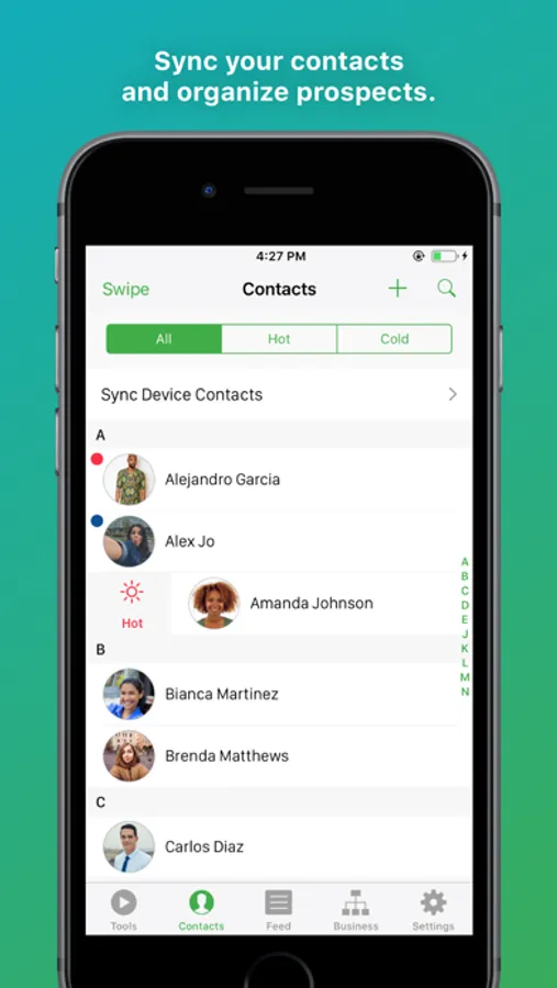 Contacts: Choose how to sync and manage your contacts. Swipe to sort them by interest level. You can make connections, add notes, or check out the Contact Feed to see the tools you've shared and contact actions.
