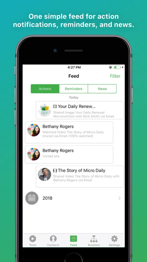 Feed: Keep track of everything you’ve shared and see what your contacts have viewed with notifications. You can even swipe notifications to mark them as a Reminder. News also brings all of the latest announcements and social posts from corporate straight to you in one convenient place!