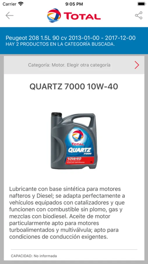 La recomendación relativa al tipo de producto, capacidad e intervalos de cambio es simplemente una sugerencia de Total Especialidades Argentina S.A. para casos estándar y puede encontrarse inexacta, desactualizada o incompleta.