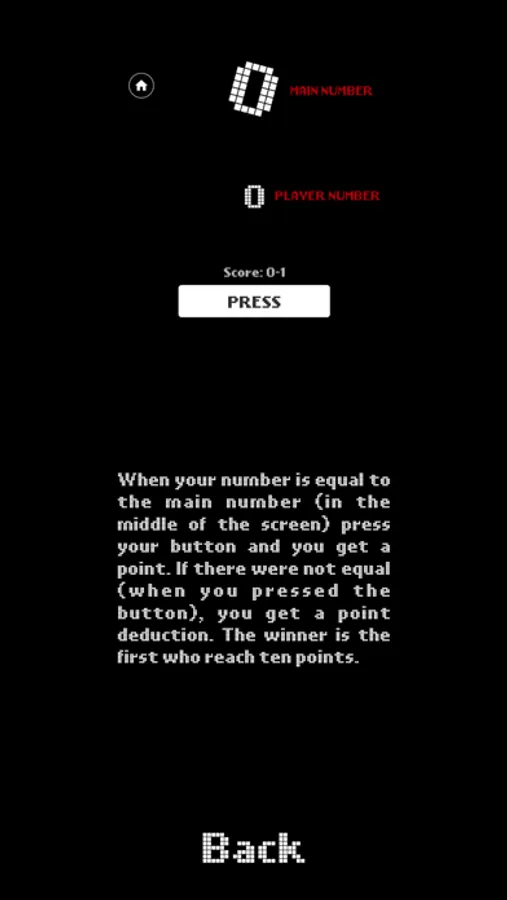 The rules: When your number is equal to the main number (in the middle of the screen) press your button and you get a point. If there were not equal (when you pressed the button), you get a point deduction. The winner is the first who reaches ten points.