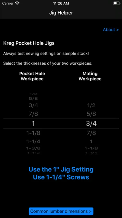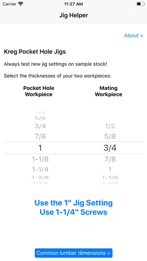 This app helps you determine what jig setting and what screw length to use in all common scenarios, including when you're mating workpieces of different thicknesses.