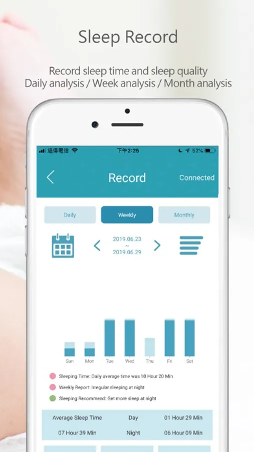 Infants spend more than 12-16 hours a day sleeping due to higher levels of growth hormone. Smart Baby Mat can report sleep time and quality. You can also improve baby’s sleep quality by streaming a lullaby or mother’s sounds through a micro-speaker in the mat.