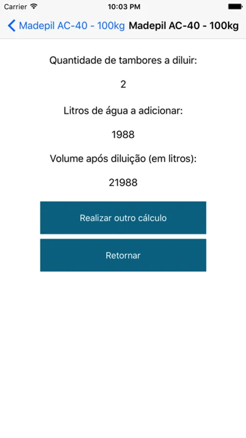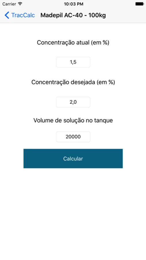 Para realizar os cálculos, basta escolher o tipo de embalagem utilizada, e inserir os parâmetros necessários (concentração atual, concentração desejada, volume de solução atual, volume de solução desejado).