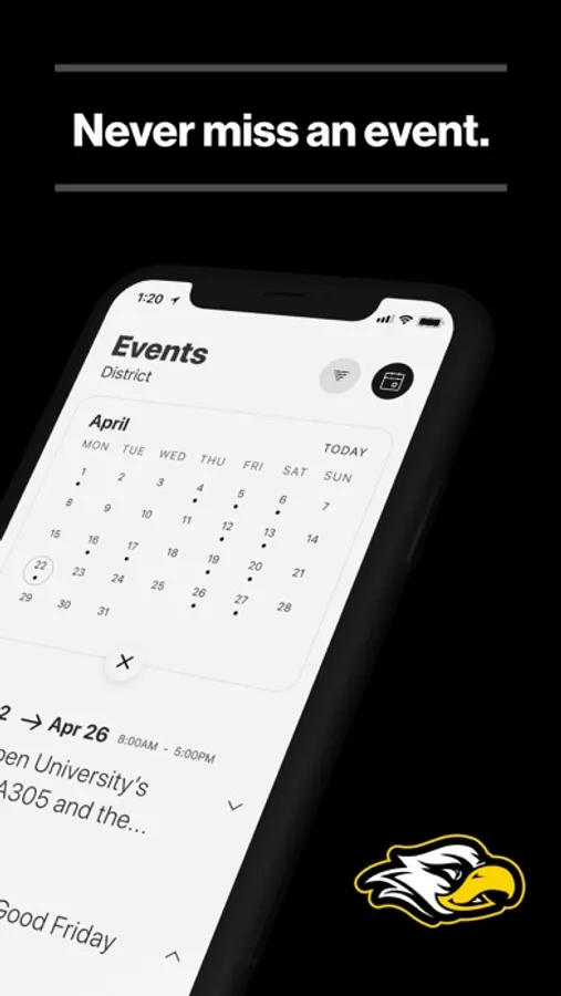 The event section shows a list of events throughout the district. Users can add an event to their calendar to share the event with friends and family with one tap.