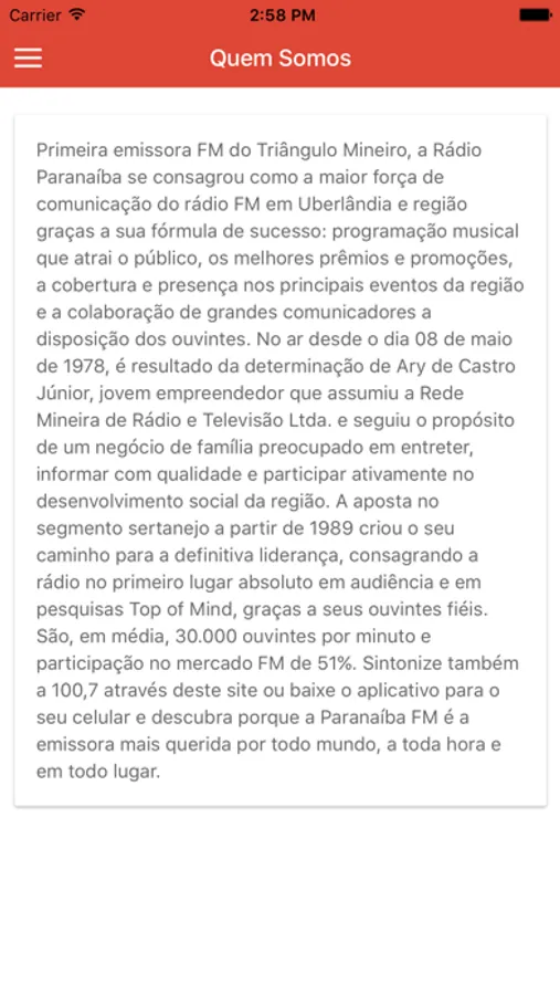 Primeira emissora FM do Triângulo Mineiro, a Rádio Paranaíba se consagrou como a maior força de comunicação do rádio FM em Uberlândia e região graças a sua fórmula de sucesso: programação musical que atrai o público, os melhores prêmios e promoções, a cobertura e presença nos principais eventos da região e a colaboração de grandes comunicadores a disposição dos ouvintes. No ar desde o dia 08 de maio de 1978, é resultado da determinação de Ary de Castro Júnior, jovem empreendedor que assumiu a Rede Mineira de Rádio e Televisão Ltda e seguiu o propósito de um negócio de família preocupado em entreter, informar com qualidade e participar ativamente no desenvolvimento social da região. A aposta no segmento sertanejo a partir de 1989 criou o seu caminho para a definitiva liderança, consagrando a rádio no primeiro lugar absoluto em audiência e em pesquisas Top of Mind, graças a seus ouvintes fiéis.