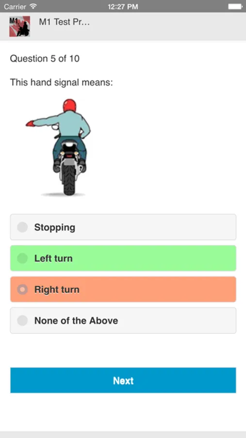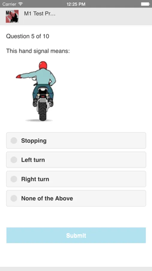 This app will help you get your written test done. It focuses strictly on motorcycle-related questions (don't waste time on basics of driving theory!) for the exam and covers all the important information from Motorcycle Handbook. Check yourself or learn faster with quizzes.