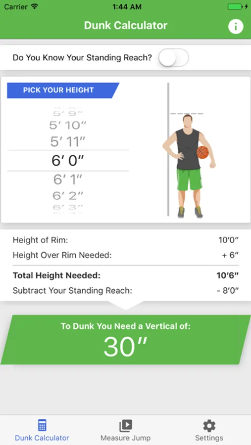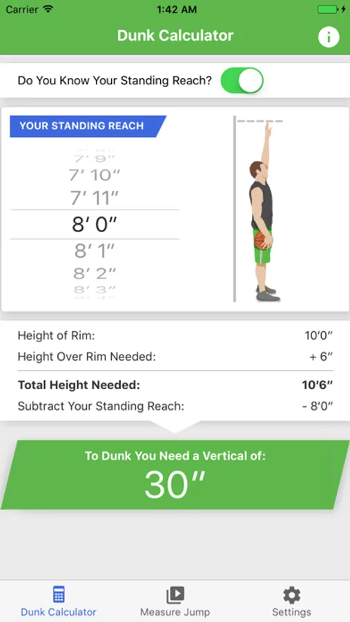 Dunk Calculator: Find out how high you need to jump to make a dunk. Put in your standing reach or height and the app will calculate the vertical jump height you need.