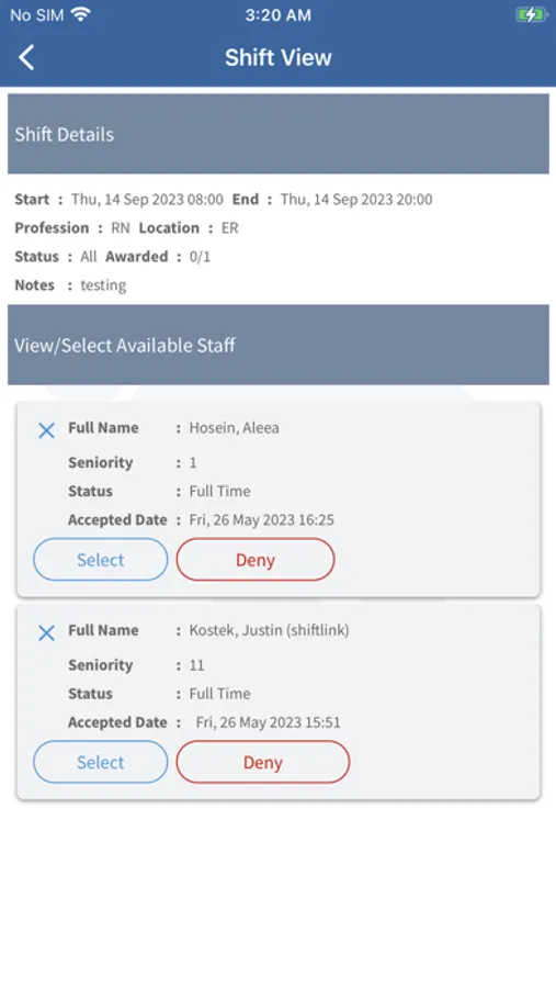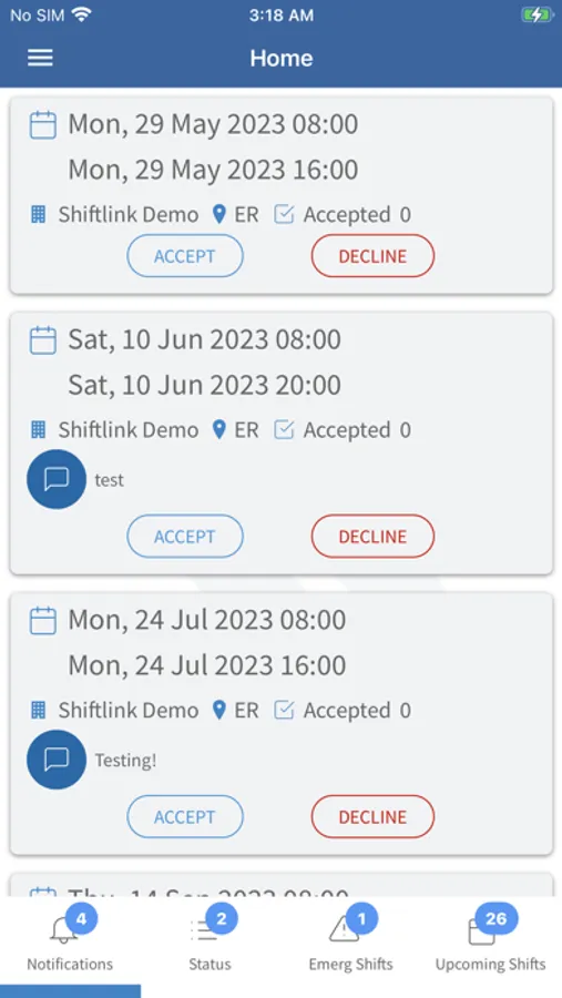 Receive shifts from your employer of choice or multiple employers. Review the shift details and then simply click ‘ACCEPT’ or ‘DECLINE’. Never miss out on a shift opportunity. No intrusive phone calls or feelings of guilt for saying ‘NO’. Supports unionized environments and seniority ranking.
