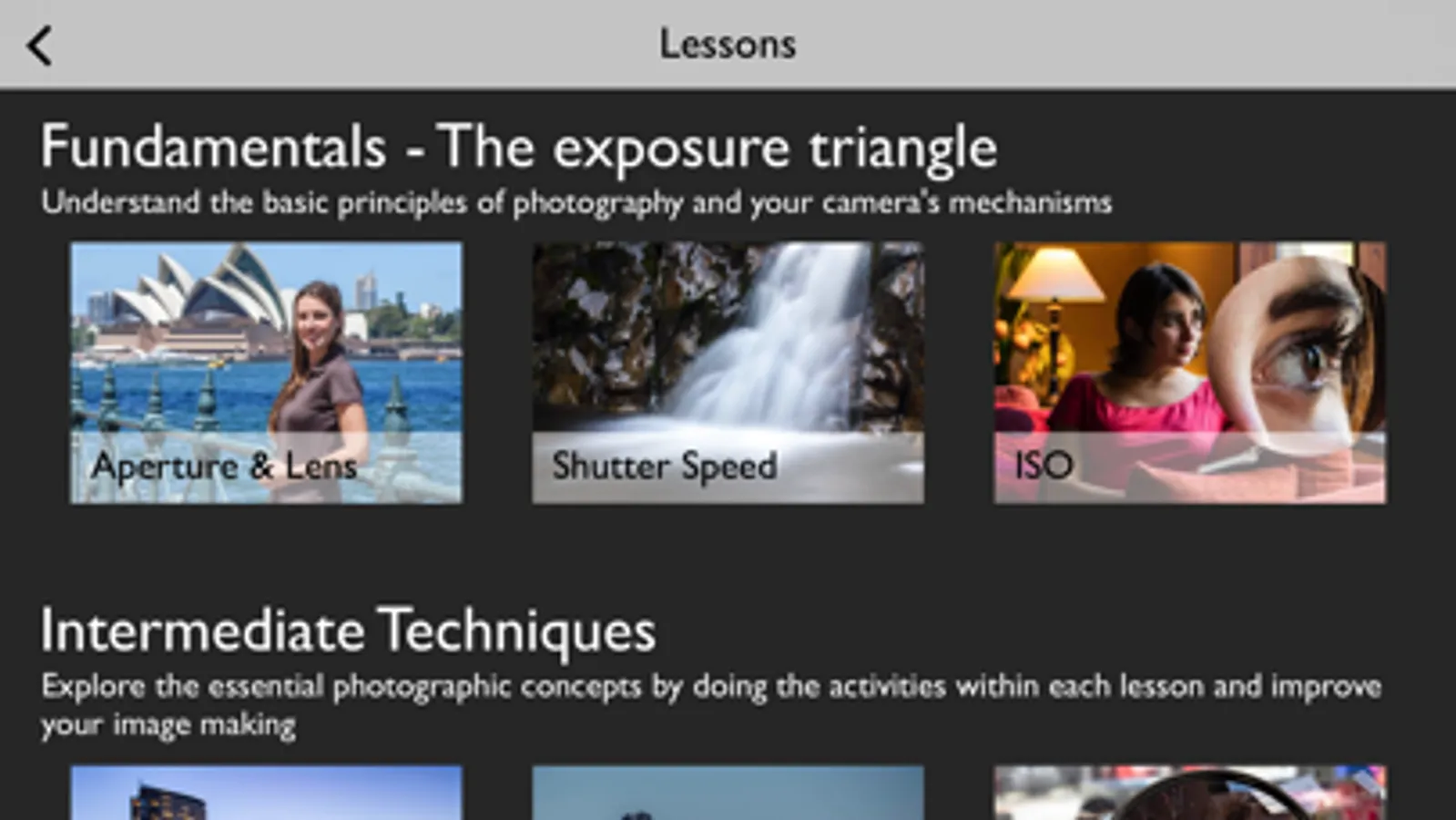 • Work through 15 interactive Fotoji lessons and activities, from the Fundamental principles of digital photography, through Intermediate to Advanced levels.