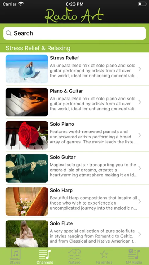 Radio Art offers many music channels including Stress Relief, Relaxing, Meditation, Sleep, Yoga, Spa, Chillout, Solo Piano, Harp, Flute, Classical, Classical Composers, Jazz, Fusion, Movies, Theatrical, Blues, Ethnic, Workout and many others.