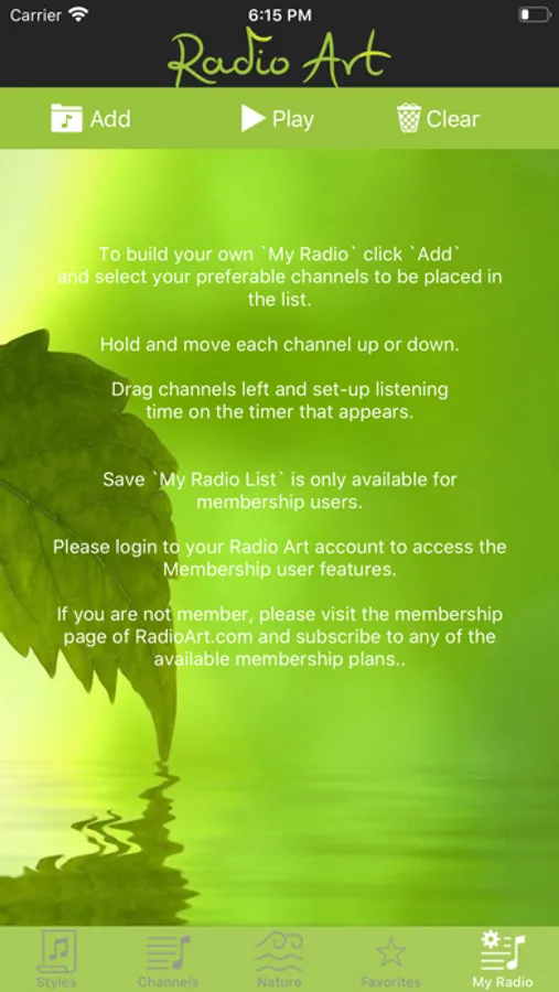 Following great efforts of development, Radio Art released a unique system for its listeners, where the listener is able to explore a broad range of options to combine music with nature sounds. For instance, the listener can add bird songs to piano music creating a sound envelope that is perfectly conductive to relaxation and rest. Furthermore, the listener can make a rotation playlist with any of the music channels, adjust the order and time of rotation and create a beautiful music atmosphere. The list can be saved and opened again at any time.