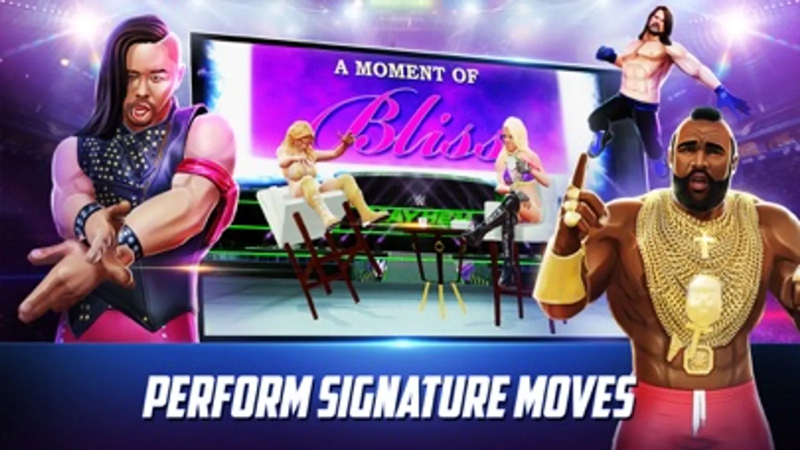 Collect, level up, and manage your teams of SuperStars wisely to receive synergy bonuses based upon team affiliation and relationships taken from the WWE Universe and Championships.
