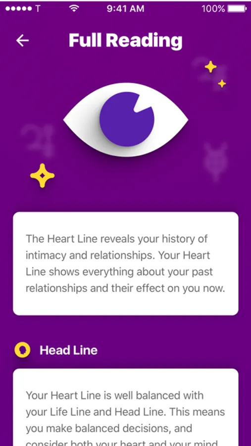 Reveal the life story written on your palm! Your palm lines contain a story about your personality, your traits and perceptions. Our palm reading app -- Palm Reader Insights Palmistry -- will help you reveal your hidden story. Palm Reader reads your palm to find and analyse your Heart Line, Life Line, Head Line, Fate Line and all the palm mounts. Get a free and personalised reading of your palm based on the ancient palm reading rules.