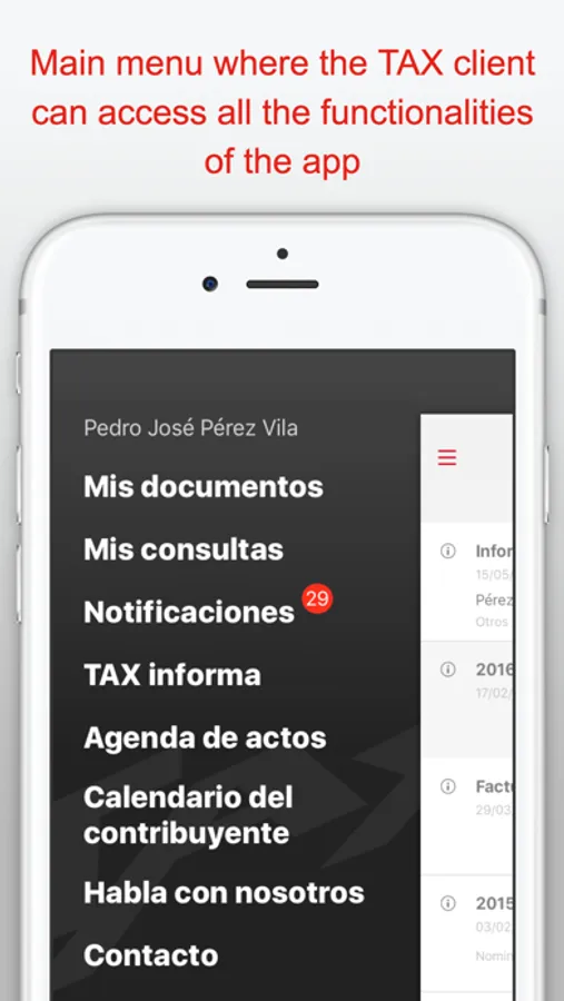 App of the TAX client portal where clients access their documents: payroll, contracts, VAT, corporate tax, among others, that performs their TAX advice.